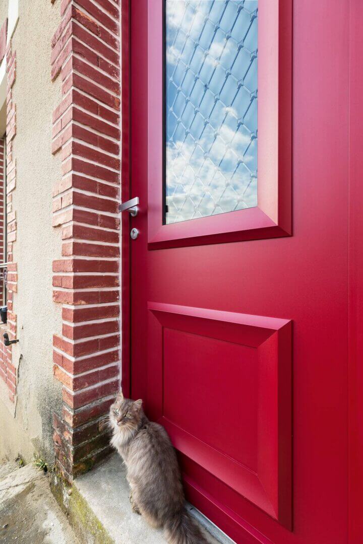 Malheureusement, le prix du remplacement par un modèle identique deux vantaux en aluminium dépassait son budget. Notre conseiller lui a proposé la gamme de porte d’entrée traditionnelle « Navarre » qui, avec ses deux vitrages verticaux, évoque l’esprit d’une porte d’entrée deux vantaux comme il avait avant. Menuiz vous trouve des solutions pour chaque problématique grâce à une approche sur mesure. Le coloris rouge permet de faire ressortir les briques apparentes qui donnent un esthétisme unique à cette maison. La porte d'entrée a été installée par nos poseurs salariés à Nîmes et dans le Gard.