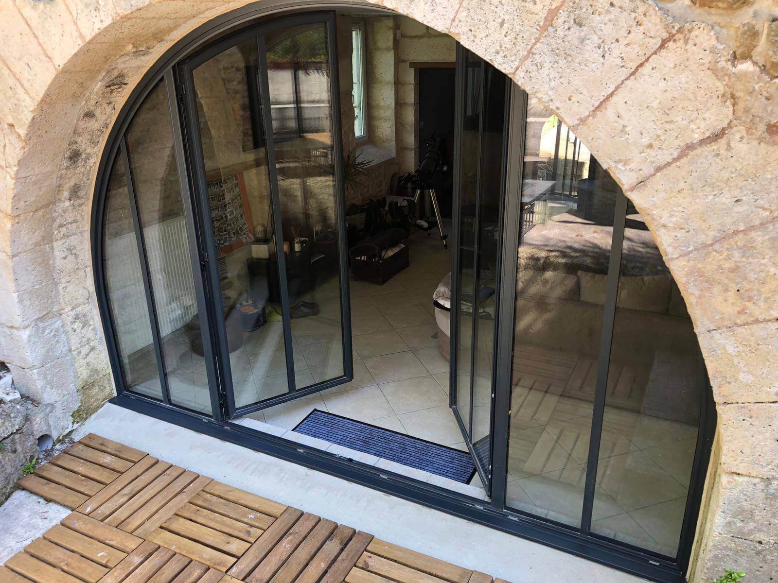Menuiz présente une magnifique rénovation de portes-fenêtres en aluminium noir type verrière. Nos clients de la région de Nîmes nous ont contactés pour rénover l’entrée de leur maison de village en pierre. Ils nous ont tout d’abord présenté leurs contraintes techniques qui étaient de s’adapter au cadre cintré et arrondi de leur ouverture.